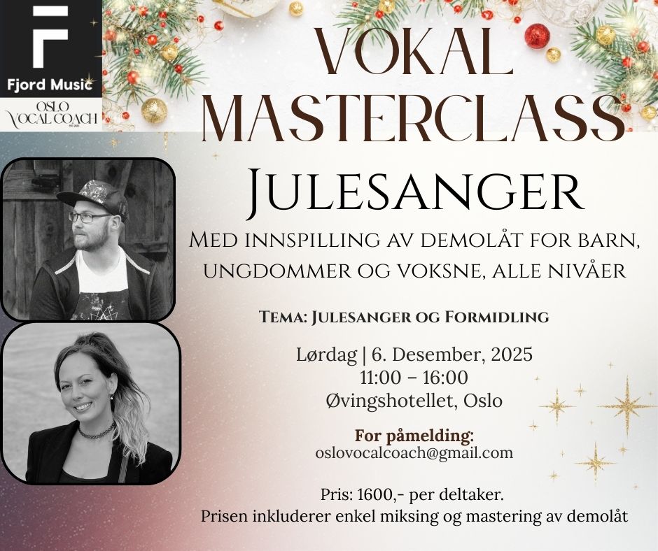 Bli med på en stemningsfull Vokal Masterclass for alle nivåer og aldre! På denne Masterclassen får alle deltakere spille inn vokal på en julelåt eller annen valgfri låt. Innspillingen blir enkelt mikset og mastret i ettertid og du får en demo- innspilling du kan gi i gave eller bruke som du vil!